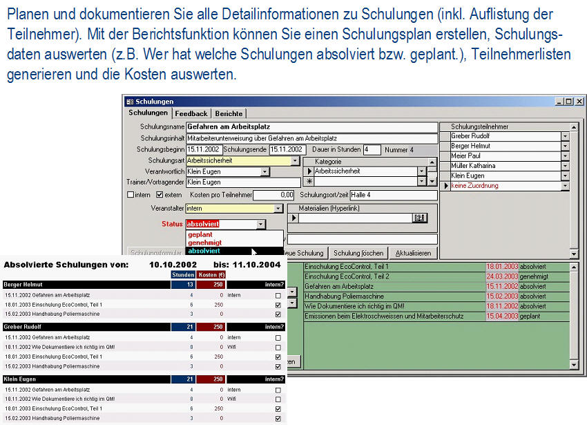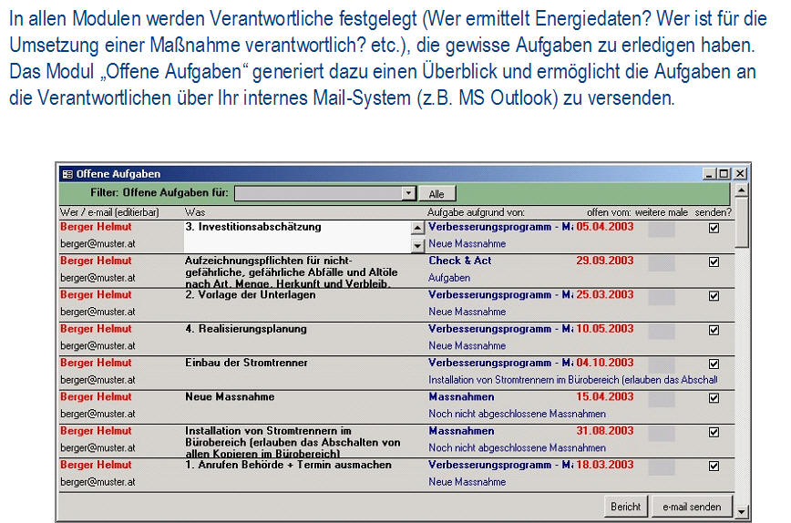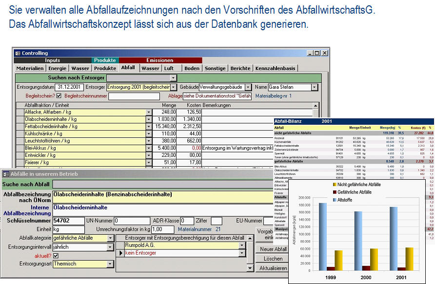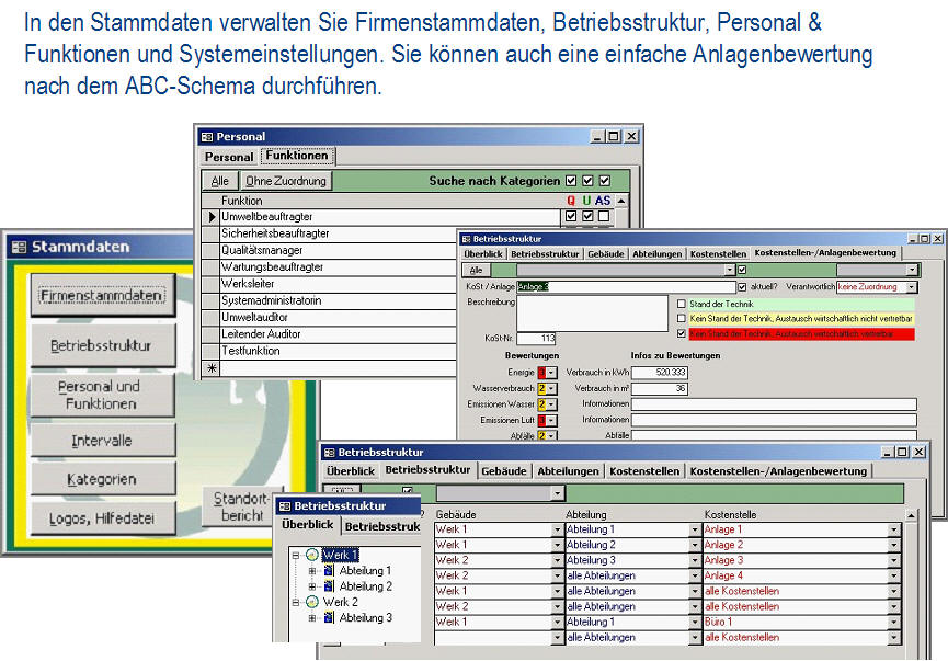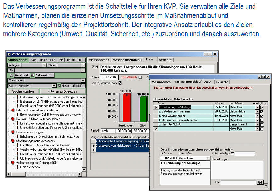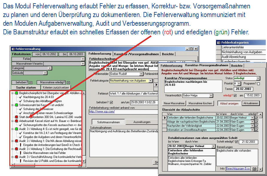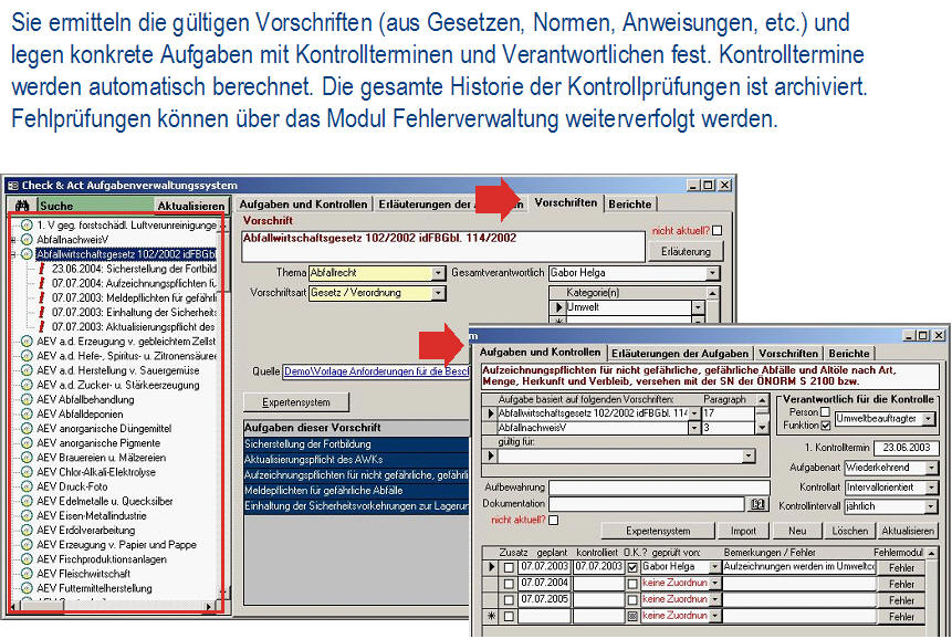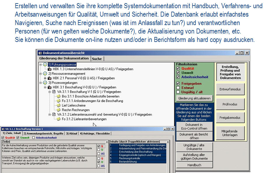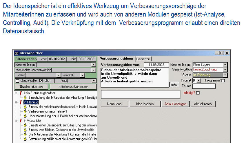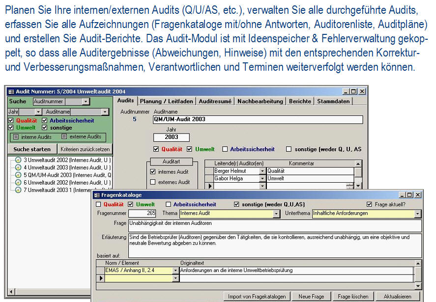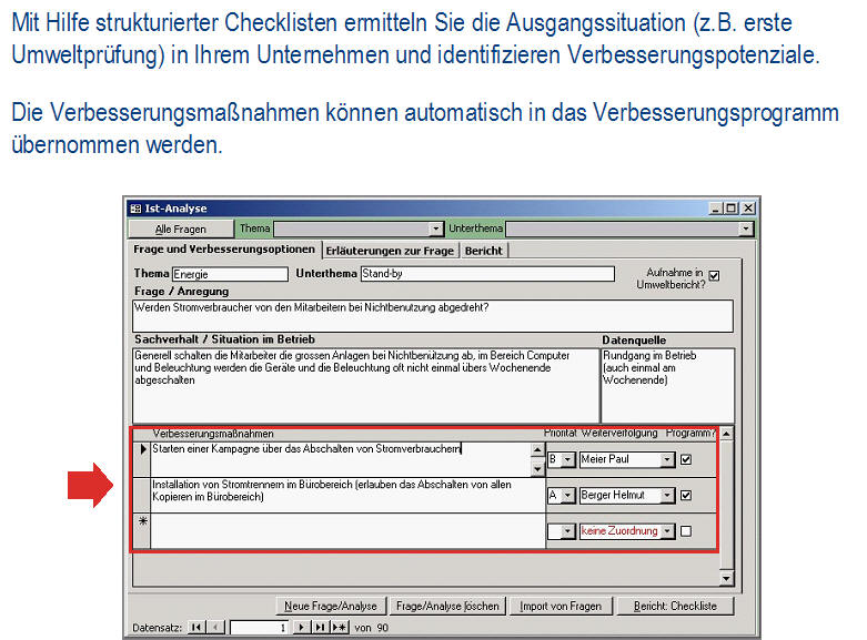 Ist-AnalyseDie Ist-Analyse ermöglicht eine checklistenartige Erfassung aller relevanten Sachverhalte bei gleichzeitiger Dokumentation der Verbesserungsmaßnahmen. Das Modul enthält einen umfangreichen Fragenkatalog. <zurück> UmweltcontrollingDas Umweltcontrolling dient für die laufende Erfassung und Bewertung der Input/Outputdaten, Kennzahlenberechnung und umfangreiche Möglichkeiten zur Berichterstellung. Dieses Modul erhält das frei definierbare Umweltregister mit einer Bewertung der umweltrelevanten Aspekte. <zurück> Aufgabenverwaltung - Legal complianceBei der Aufgabenverwaltung werden die gültigen Vorschriften (aus Gesetzen, Normen, Anweisungen, Kalibriervorschriften, etc.) ermittelt und konkrete Aufgaben mit Kontrollterminen und Verantwortlichen festgelegt. Die Kontrolltermine werden automatisch berechnet, die gesamte Historie der Kontrollprüfungen archiviert. Fehlprüfungen können über das Modul Fehlerverwaltung weiterverfolgt werden. <zurück> Verbesserungsprogramm und IdeenspeicherIm Verbesserungsprogramm und im Ideenspeicher werden die Verbesserungsmöglichkeiten dokumentiert und verwaltet. <zurück> SchulungenIm Modul Schulungen werden alle Detailinformationen zu Schulungen (inkl. Auflistung der Teilnehmer) geplant und dokumentiert. Mit der Berichtsfunktion werden Schulungspläne erstellt, Schulungsdaten ausgewertet, Teilnehmerlisten generiert und die Kosten ausgewertet. <zurück> DokumentationDie Dokumentation dient zur Verwaltung der Systemdokumentation mit Handbuch, Verfahrens- und Arbeitsanweisungen für Qualität, Umweltschutz und Sicherheit. Die Datenbank erlaubt einfachstes Navigieren, Suche nach Ereignissen (was ist im Anlassfall zu tun?) und verantwortlichen Personen (für wen gelten welche Dokumente?). Man kann die Dokumente online nutzen und/oder in Berichtsform als hard copy ausdrucken. <zurück> AuditsIm Modul Audits werden die internen und externen Audits (Q/U/AS, etc.) verwaltet. Bei den durchgeführten Audits werden alle Aufzeichnungen (Fragenkataloge mit/ohne Antworten, Auditorenliste, Auditpläne) erfasst und Audit-Berichte erstellt. Das Audit-Modul ist mit Ideenspeicher & Fehlerverwaltung gekoppelt, so dass alle Auditergebnisse (Abweichungen, Hinweise) mit den entsprechenden Korrektur- und Verbesserungsmaßnahmen, Verantwortlichen und Terminen weiterverfolgt werden können. <zurück> FehlerverwaltungBei der Fehlerverwaltung verwaltet man Korrektur- bzw. Vorsorgemaßnahmen und deren Überprüfung. Die Fehlerverwaltung kommuniziert mit den Modulen Aufgabenverwaltung, Audit und Verbesserungsprogramm. <zurück> Offene AufgabenIm Modul Offene Aufgaben werden die „Offene Aufgaben“ aus allen anderen Modulen angezeigt. Diese können über das interne Mail-System (z.B. MS Outlook) an die betroffenen Personen versendet werden. <zurück> StammdatenverwaltungDie Stammdatenverwaltung werden Personaldaten und die Betriebsstruktur verwaltet. Darüber hinaus ist eine ökologische Bewertung der Anlagen und die Erfassung der Stellen- und Funktionsprofile möglich. <zurück>